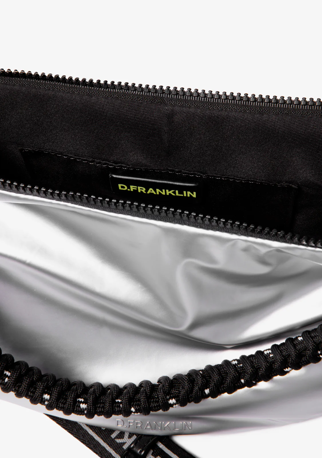 Este accesorio de exterior 100% poliéster plateado cuenta con una asa extraíble de cuerda negra de 48cm para un acabado sofisticado. Cierre de cremallera y bolsillo interior. Logotipo D.Franklin en color negro en la parte frontal. Además, incluye una asa larga estampada extraíble de 3cm de ancho y ajustable entre 90 cm y 130 cm.